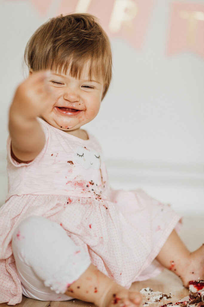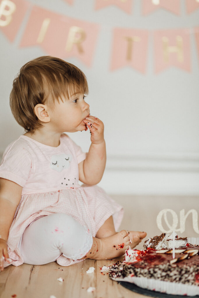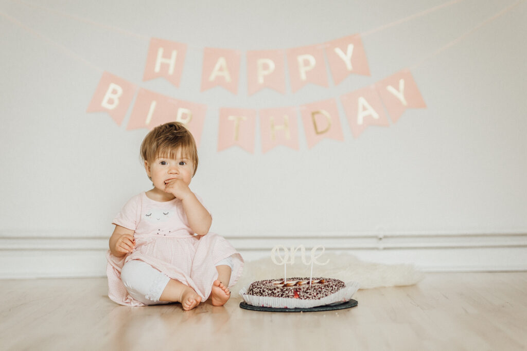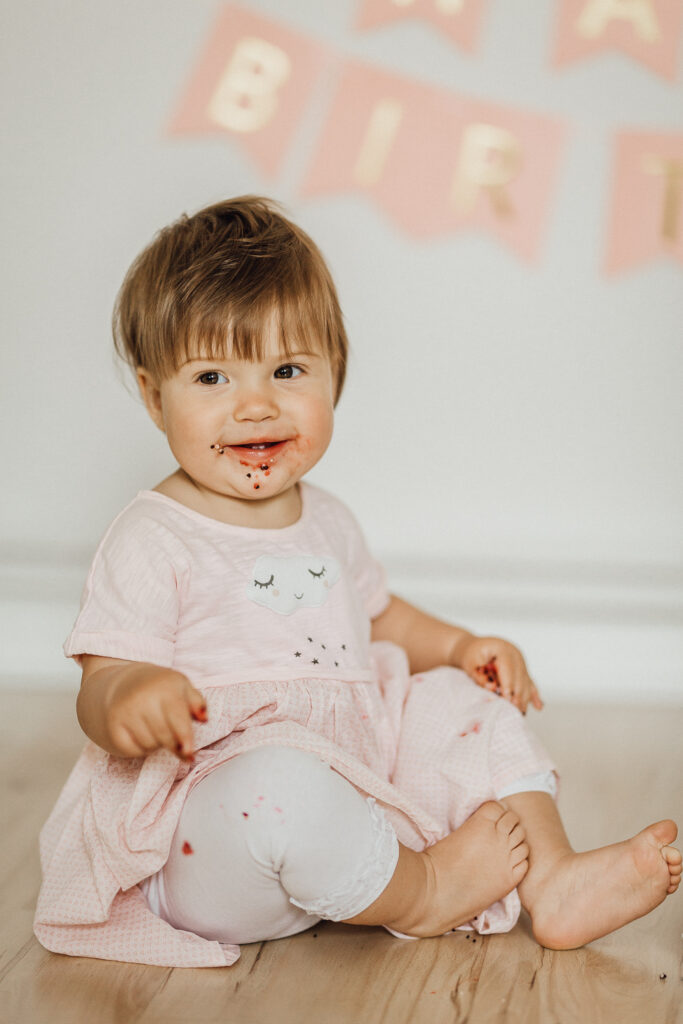 Es ist ein wunderbarer Zeitpunkt, die Kleinen fotografieren zu lassen, wie z.B. bei einem Geburtstagsshooting. Das muss gar nicht wie hier eine Cake Smash Session zuhause sein, sondern kann auch einfach nur mit anderen Elemente passend zum Geburtstagsthema gestaltet werden. Auch bei diesen Shootings verzichte auf ein Studio oder großes Lichtequipment, sondern gestalte es ganz nach meinem Stil sehr natürlich und schlicht. Bei diesem Shooting waren wir im Wohnzimmer und haben ganz einfach nur mit wenigen, farblich abgestimmten Elementen ein kleines, niedliches Set erschaffen.