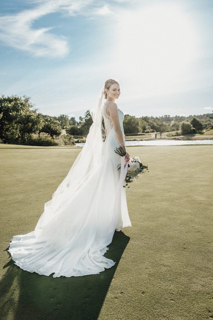 Im Anschluss fuhr ich mit dem Brautpaar auf Golfkarts über den Golfplatz zu einigen schönen Orten für Paarfotos. Glücklicherweise fand sich später auch nochmal eine Lücke bei traumhaften Abendlicht, um nochmal ein paar Brautpaarfotos im Sonnenuntergang zu machen.