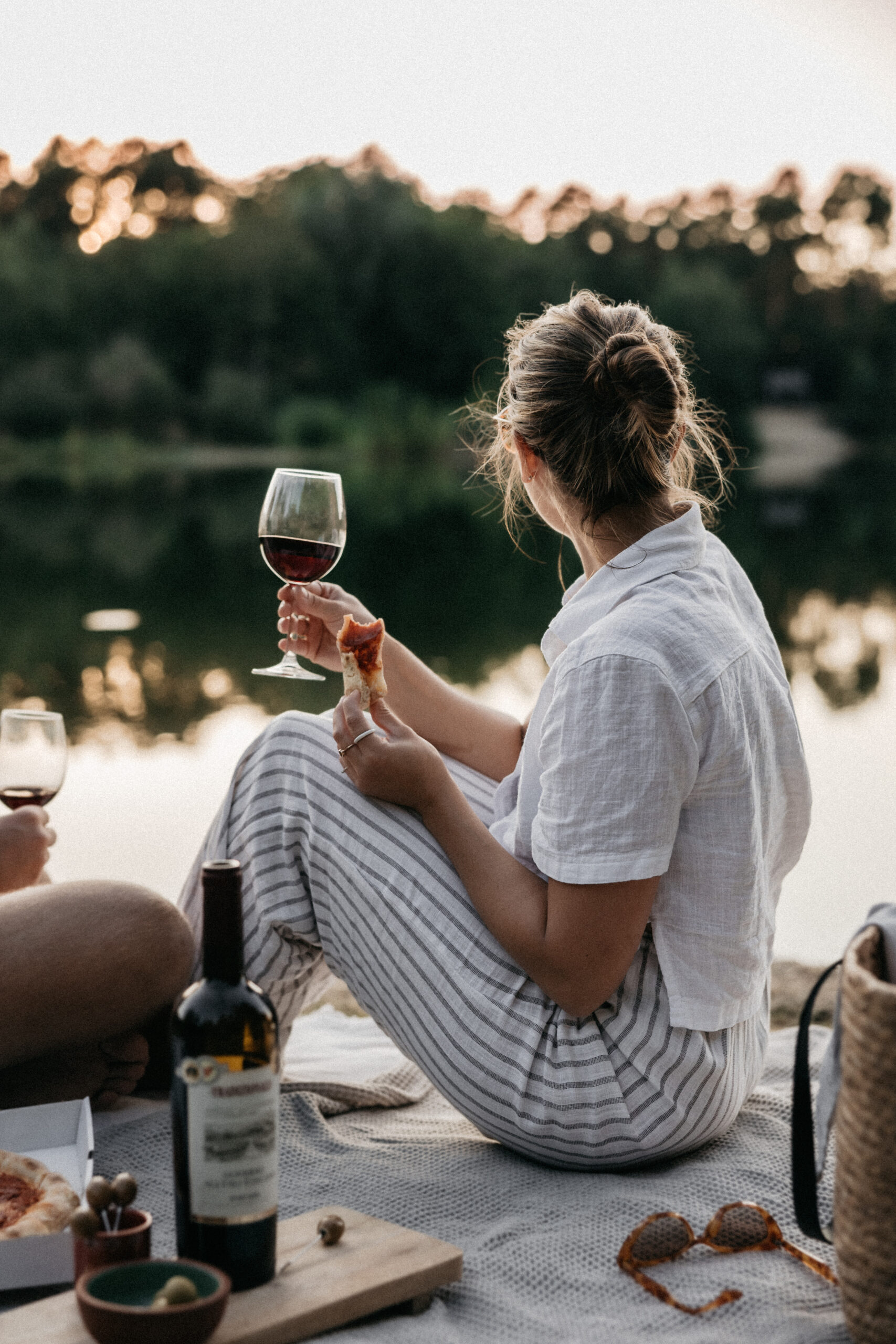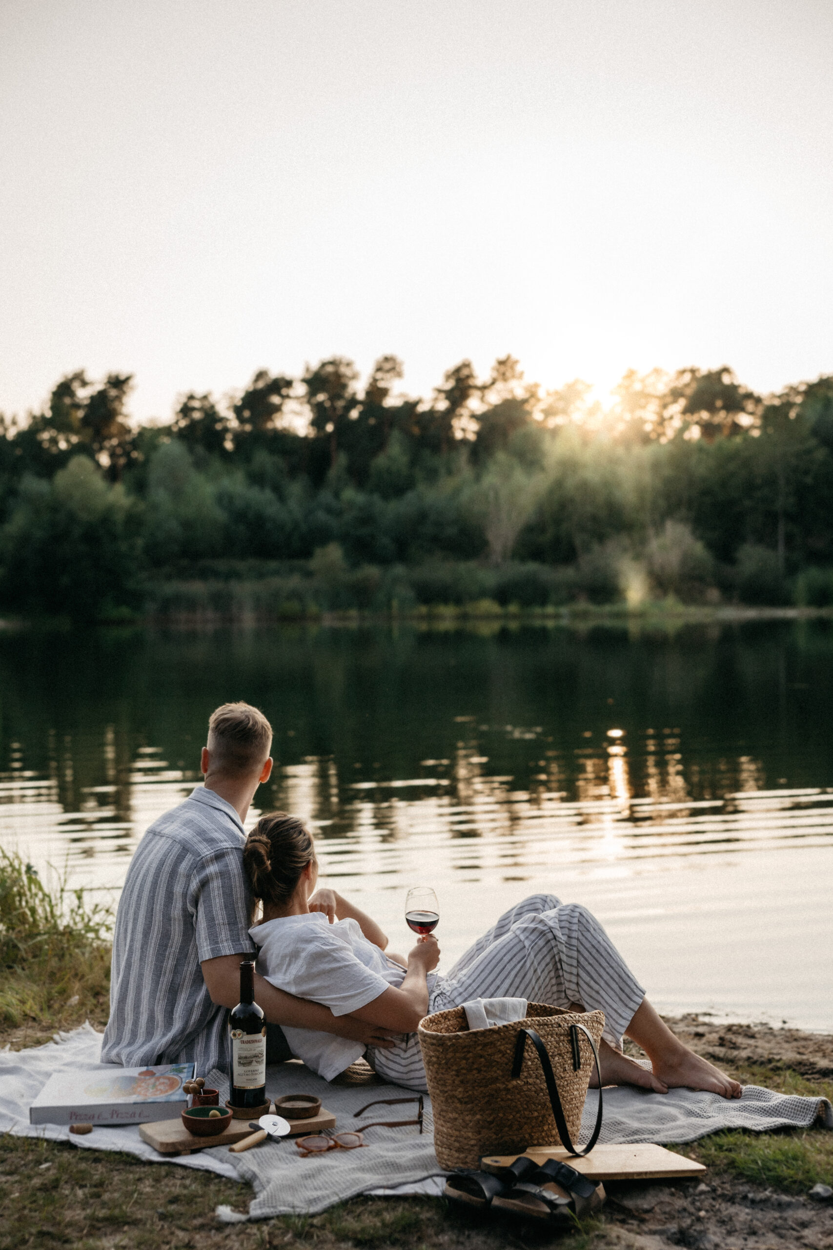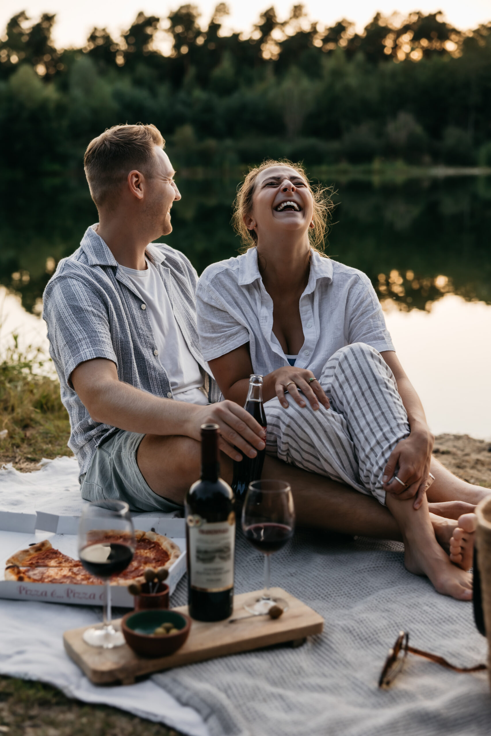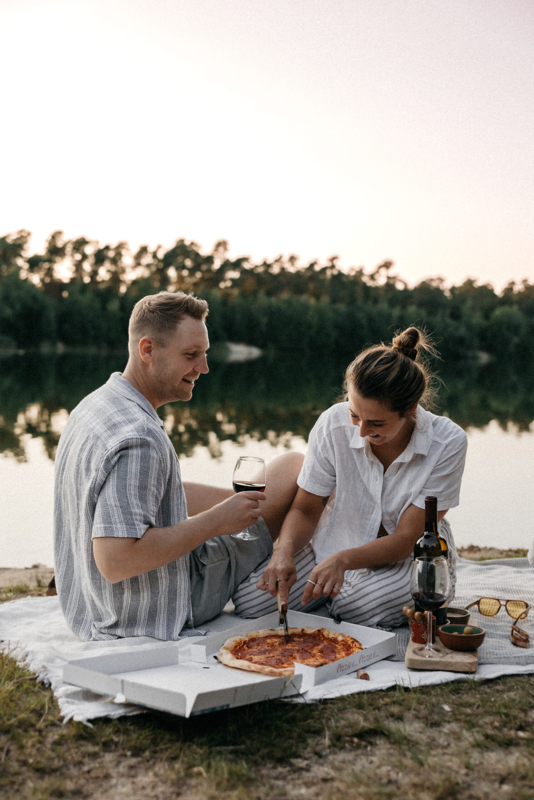 Dieses Paar Fotoshooting in der Velpker Schweiz bei Wolfsburg zeigt, wie entspannt und natürlich Paarfotografie sein kann. An einem warmen Sommerabend, nur wenige Kilometer von Wolfsburg entfernt, haben wir direkt am Strand ein kleines Picknick mit Pizza und Wein aufgebaut.